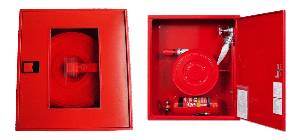 Comprende la provisión e instalación de: Gabinetes (caja de combate a incendios) de empotrar o sobreponer, con mangueras para el combate de incendios, con todos los accesorios necesarios para su funcionamiento [Llave de ángulo, adaptaciones Storz, reducciones tipo Storz, manguera y Pitón troncocónico o boquilla regulable tipo neblina según se especifique en los planos]
